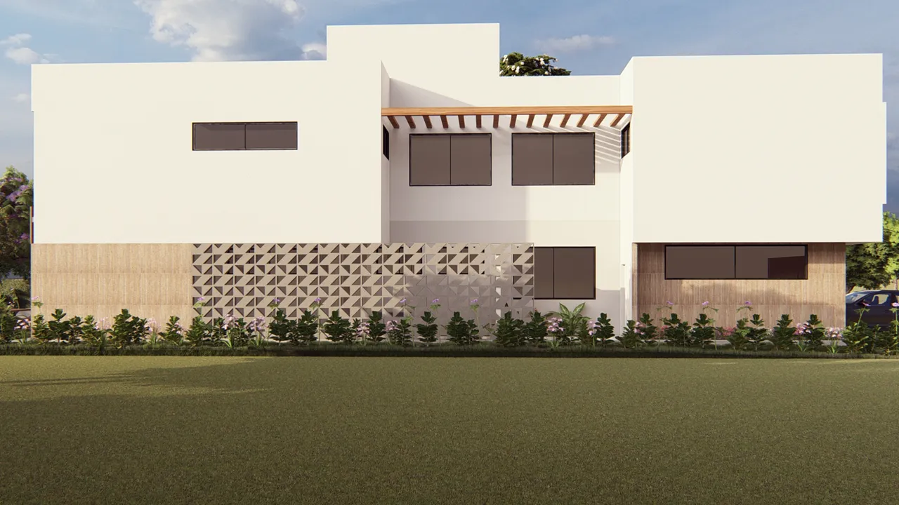 O projeto 2RLN é uma residência unifamiliar que se destaca por seu design único, com uma fachada inovadora que mescla elementos tradicionais e modernos. A utilização de cobogós, típica do nordeste, cria uma sensação de privacidade e um jogo de luz e sombra internos. As formas triangulares conferem personalidade à fachada, enquanto a integração com a natureza é promovida através de uma horta terapêutica e lago projetado, criando um ambiente que privilegia o contato com a natureza e proporciona momentos de relaxamento e bem-estar.