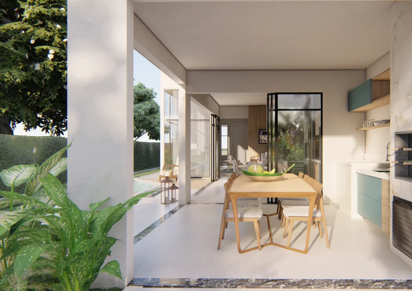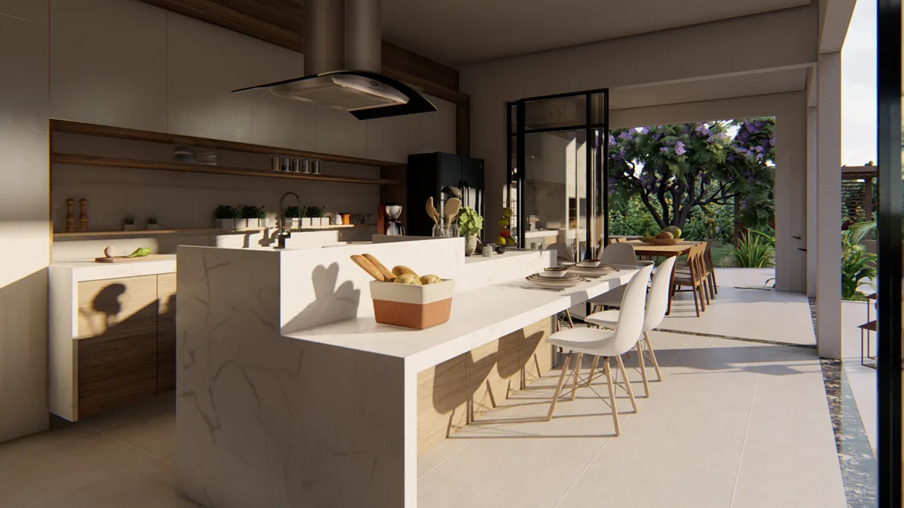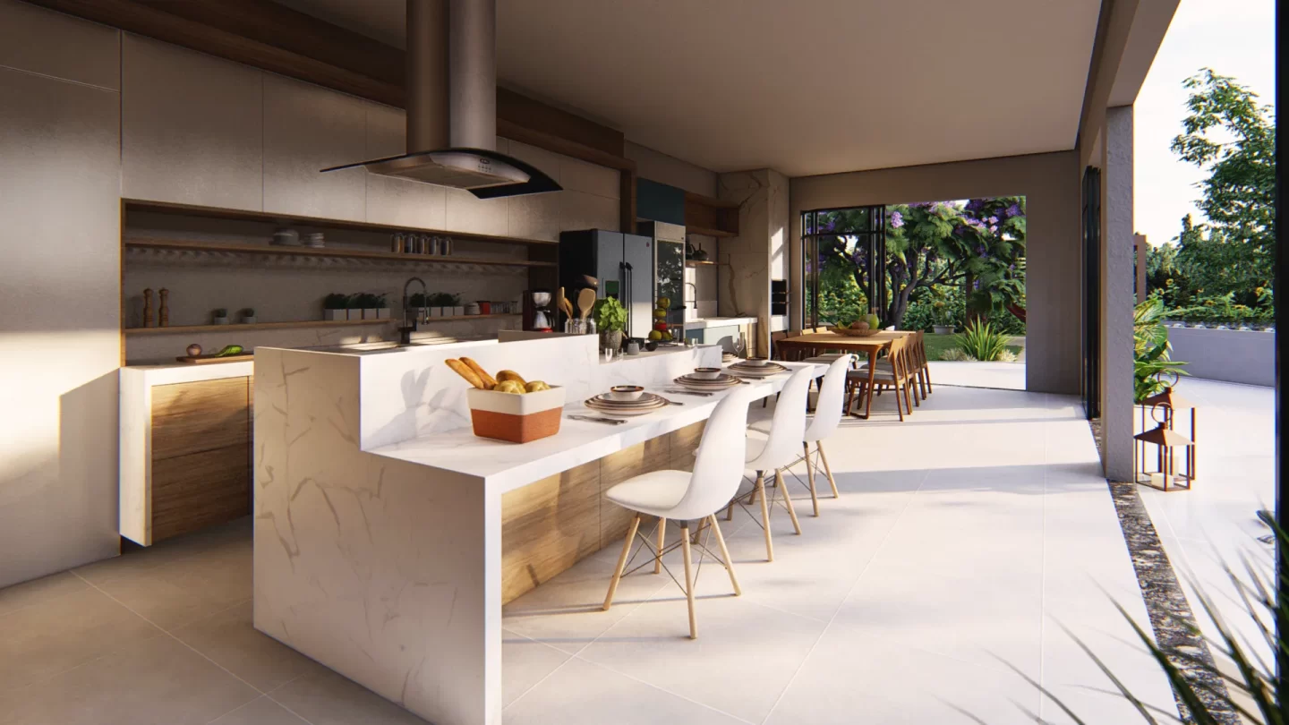 • Espaços Gourmet e Externos: A cozinha e a área gourmet foram projetadas para se abrirem ao espaço externo, favorecendo a convivência social e a interação com a natureza, tornando o ambiente ideal para momentos em família ou com amigos.