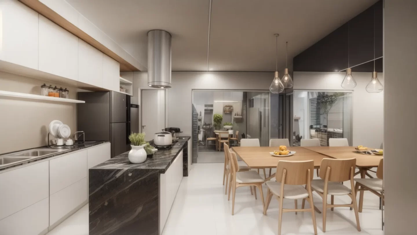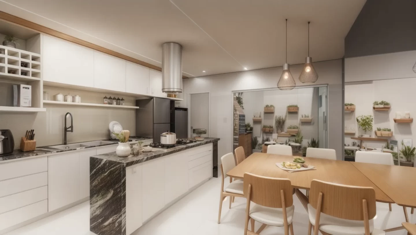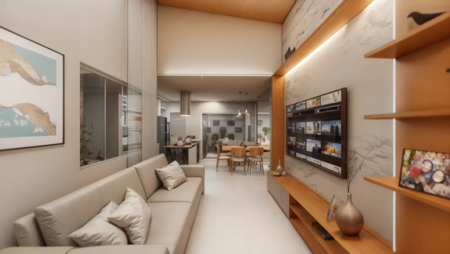 - Integração dos Ambientes: Sala, cozinha e sala de jantar foram projetadas em um único espaço, criando uma área ampla e fluida.