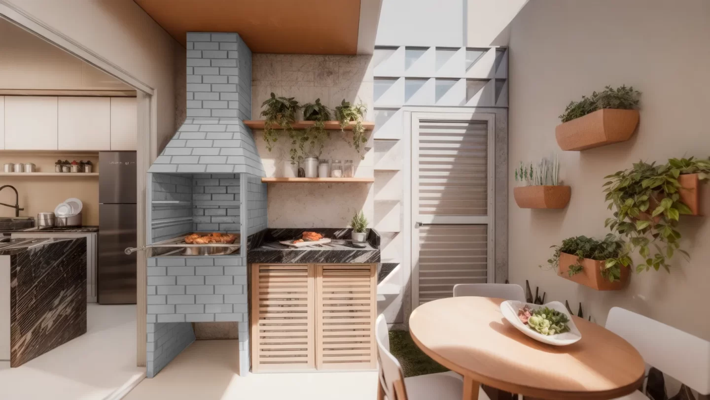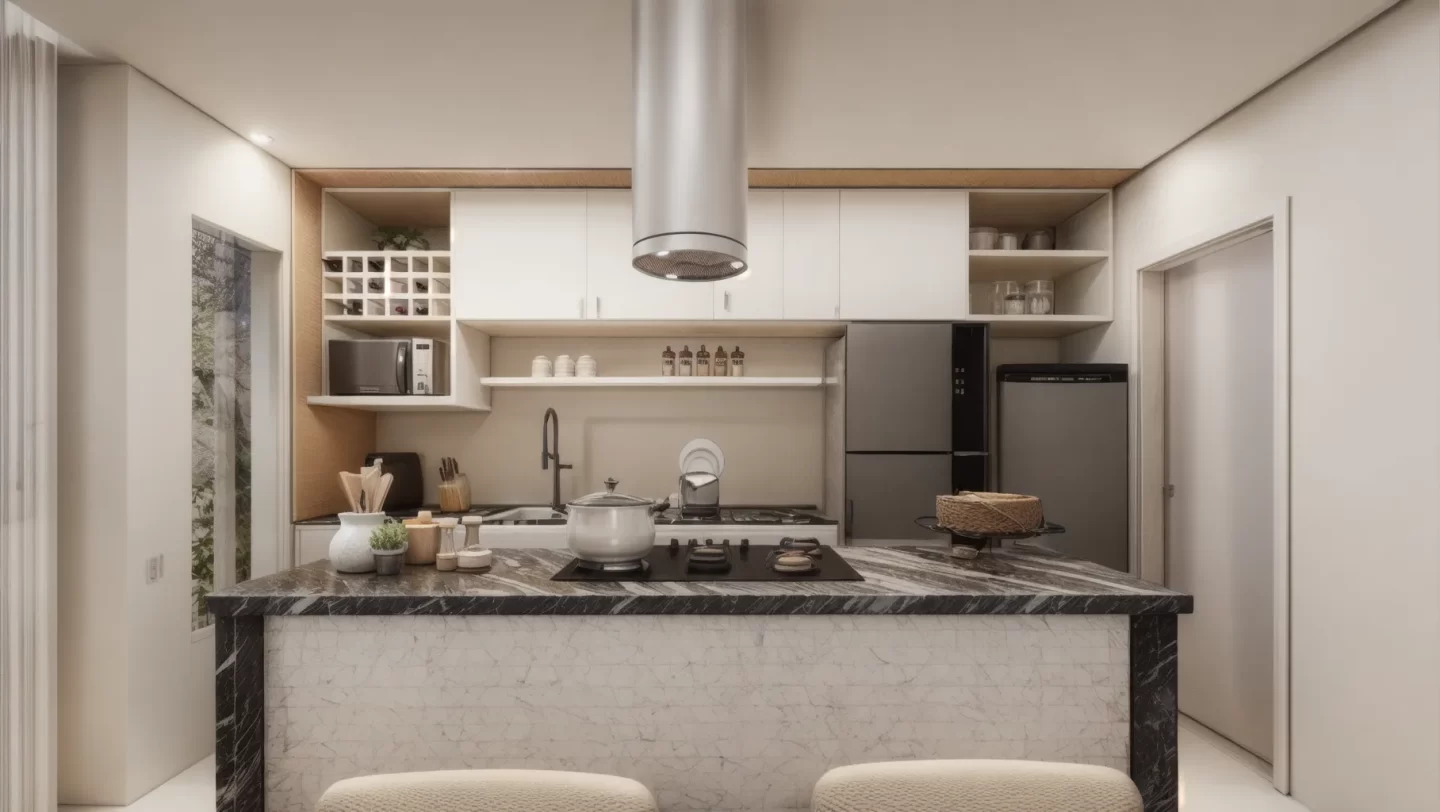 - Otimização de Espaços: A cozinha conta com uma ilha equipada com cooktop e coifa, formando um triângulo de funcionalidade que facilita o dia a dia.
