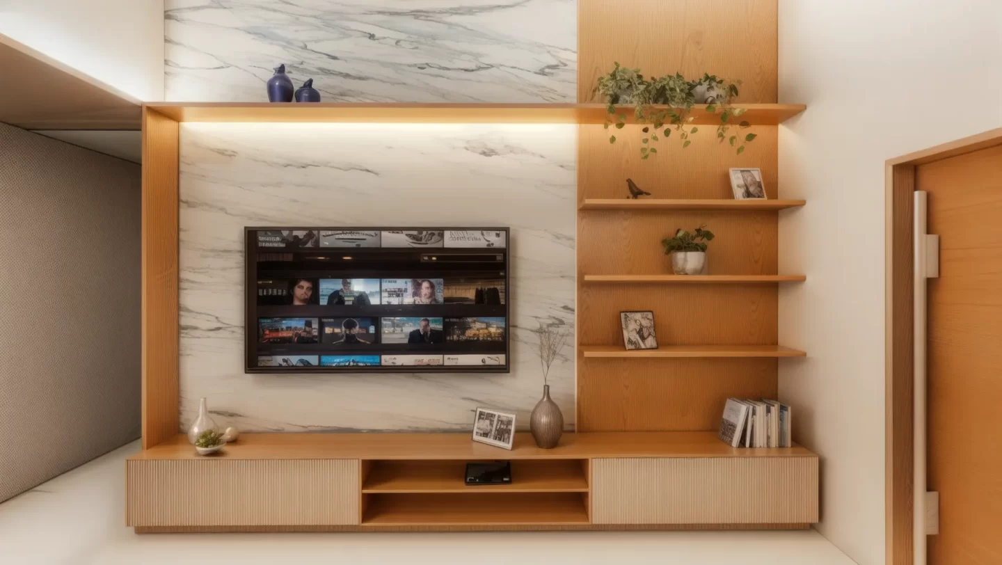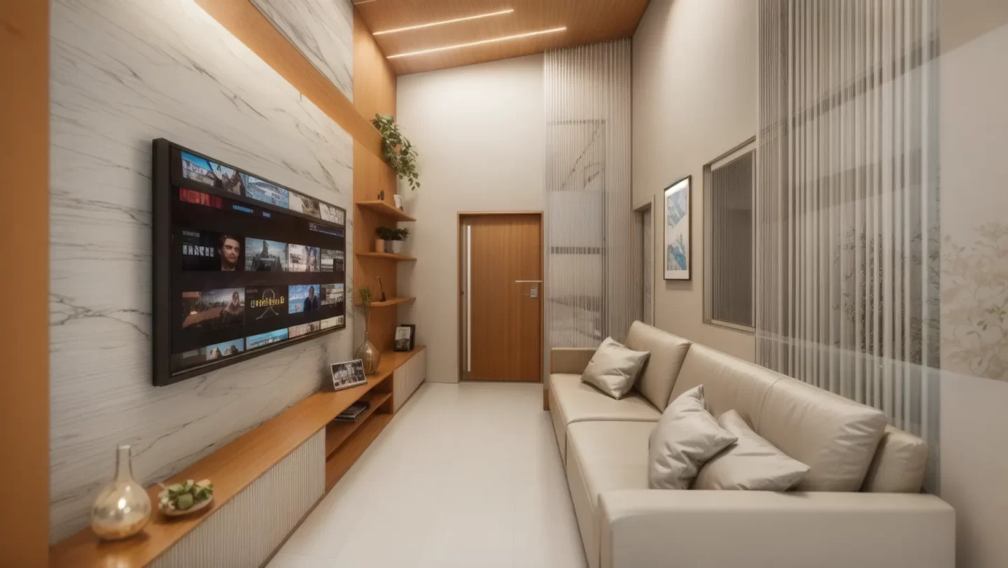 - Uso de Madeira: A madeira foi aplicada no teto e nos móveis, trazendo aconchego e equilíbrio ao ambiente neutro.