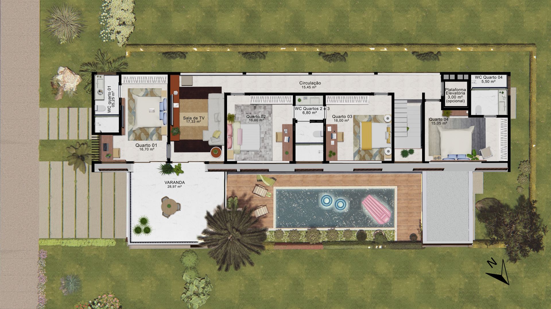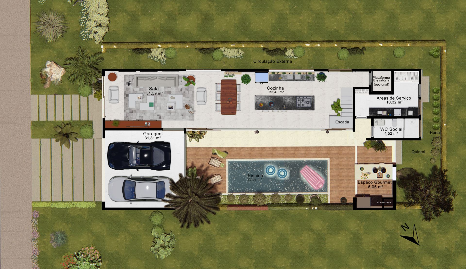• Sustentabilidade: Preparada para instalação de placas solares e captação de água da chuva, a residência promove eficiência energética e respeito ao meio ambiente. Além disso, a possibilidade de incluir uma plataforma elevatória garante acessibilidade e conforto para todos os moradores.