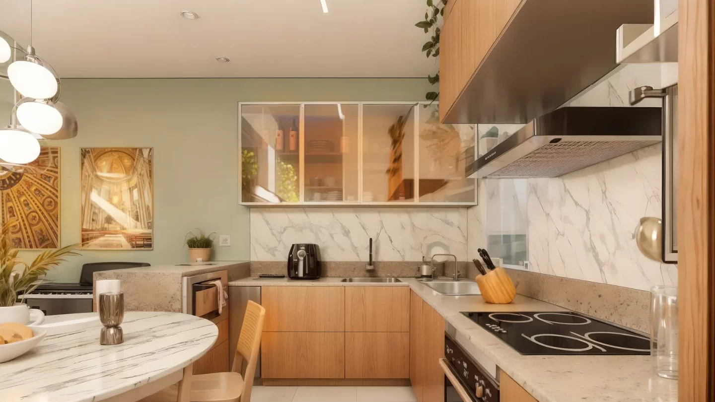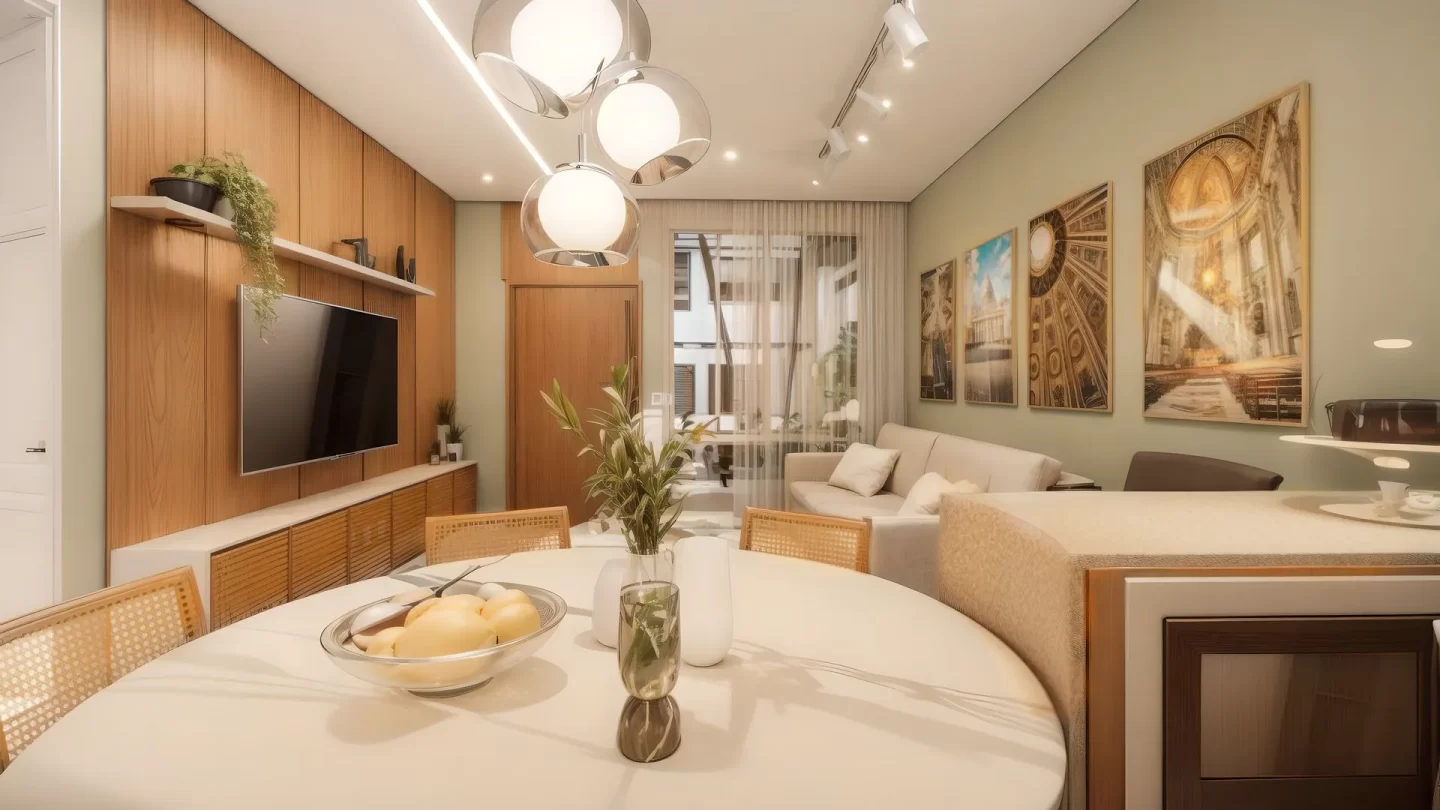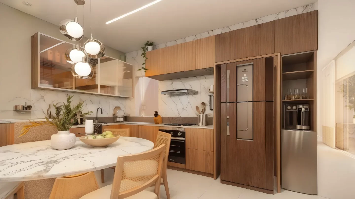 - Integração de Sala e Cozinha: Com tons neutros e uma disposição que favorece a convivência, os espaços foram integrados de maneira harmoniosa, criando um ambiente acolhedor e elegante.