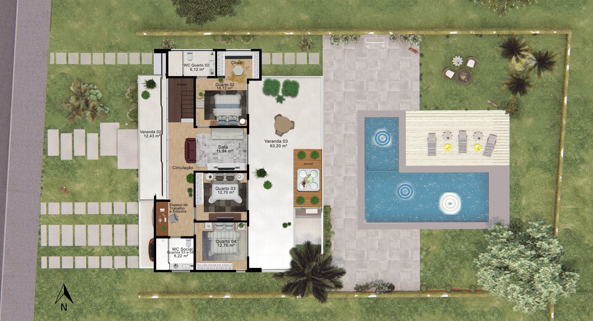 • Área Privativa com Vista: No pavimento superior, três quartos, incluindo uma suíte, são complementados por duas varandas. Uma delas oferece vista para a piscina, enquanto a outra é voltada para o nascer do sol, ideal para momentos de relaxamento.
