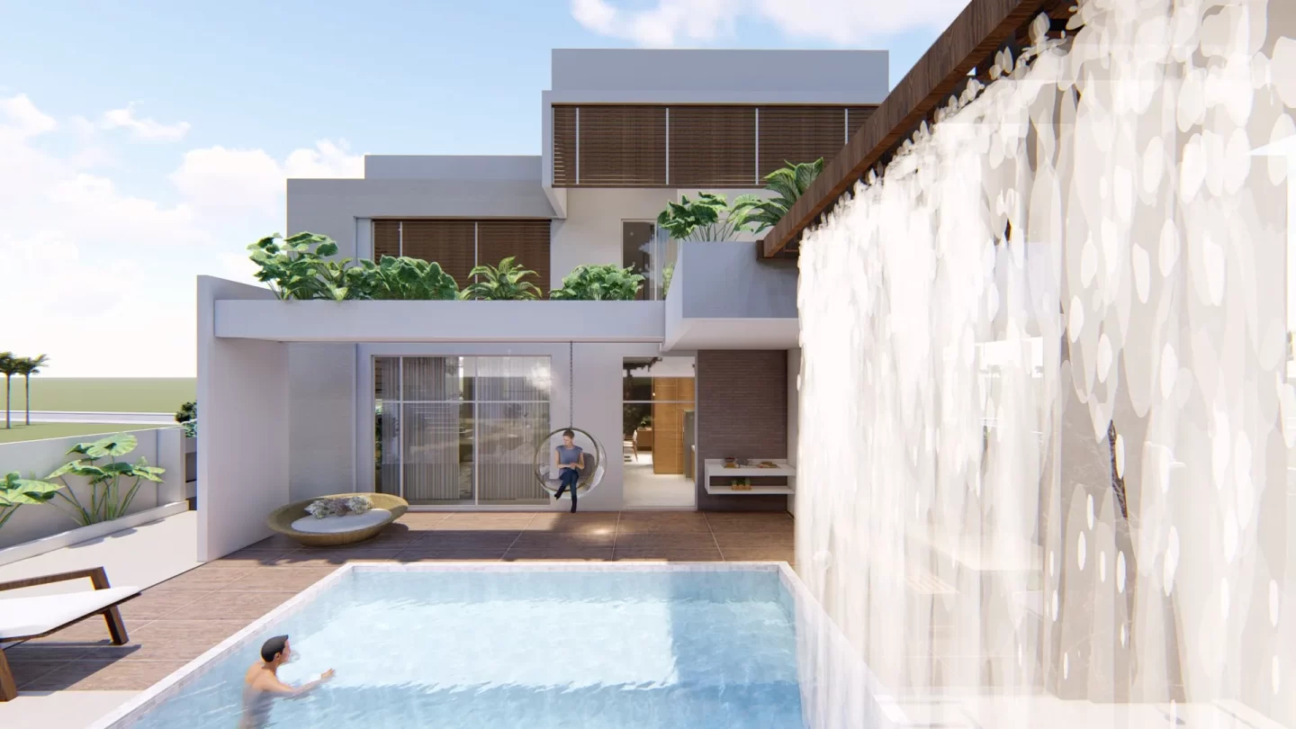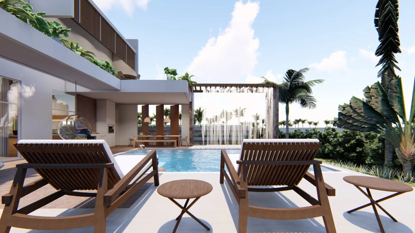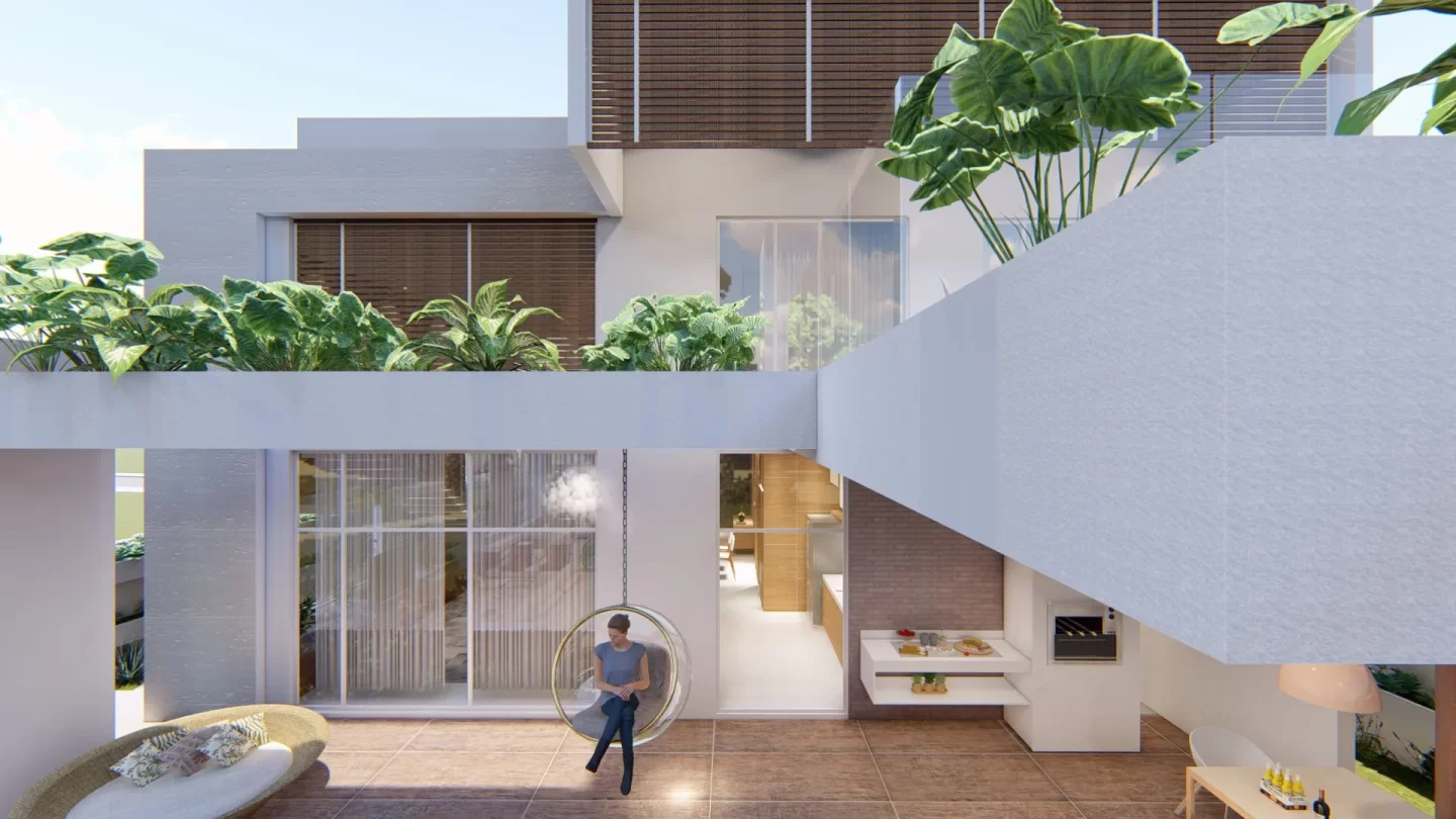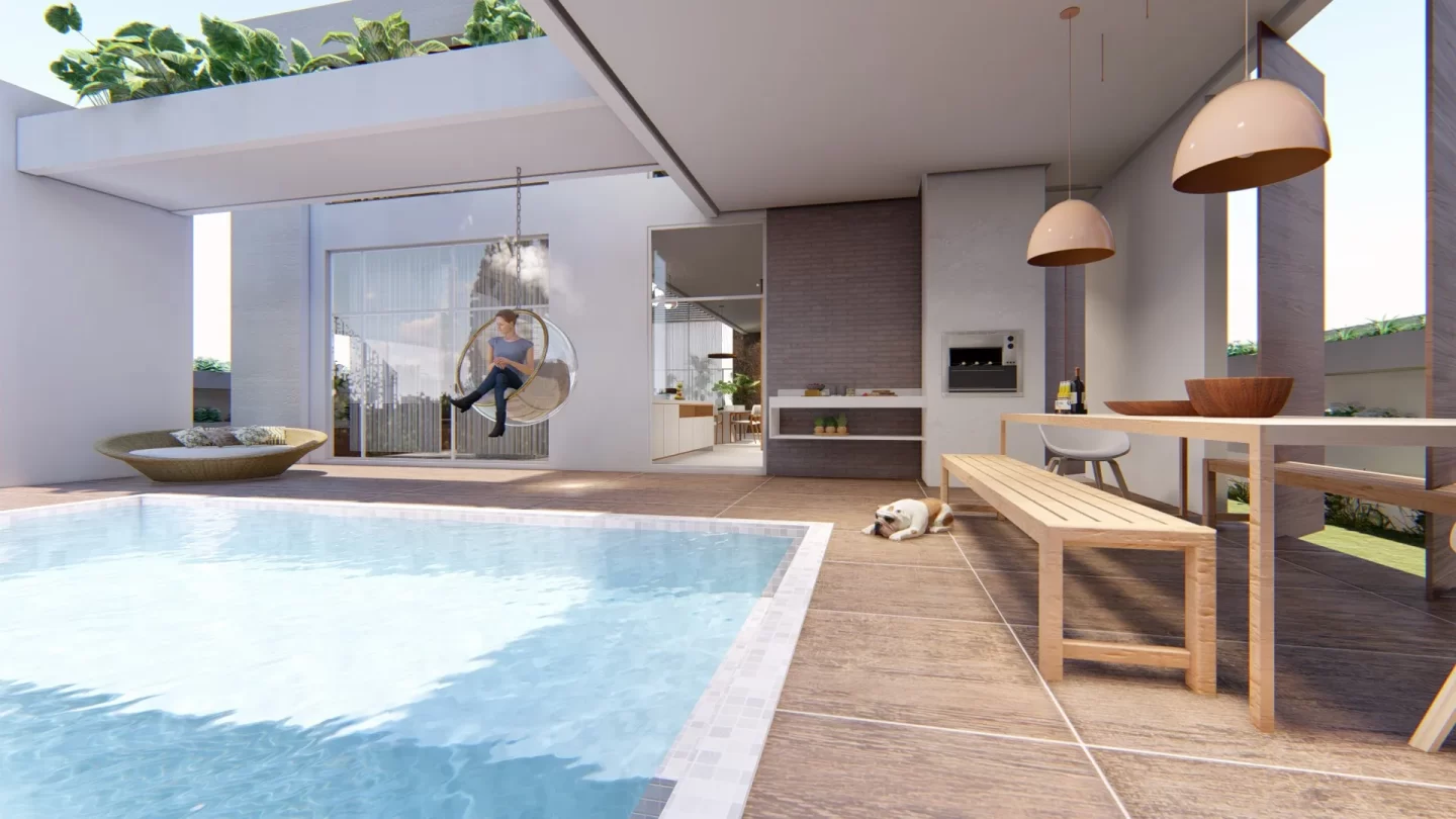 • Distribuição Funcional: Com dois pavimentos, o térreo abriga os setores sociais, de lazer e serviços, incluindo uma área dedicada à piscina e um deck molhado, criando uma integração perfeita entre os espaços internos e externos.