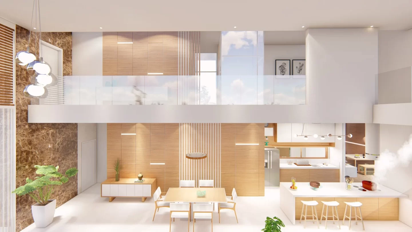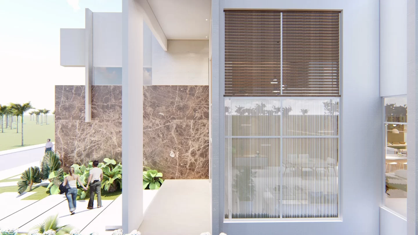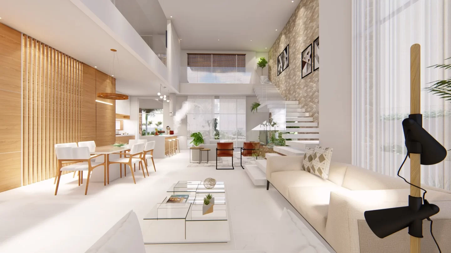 • Distribuição Funcional: Com dois pavimentos, o térreo abriga os setores sociais, de lazer e serviços, incluindo uma área dedicada à piscina e um deck molhado, criando uma integração perfeita entre os espaços internos e externos.