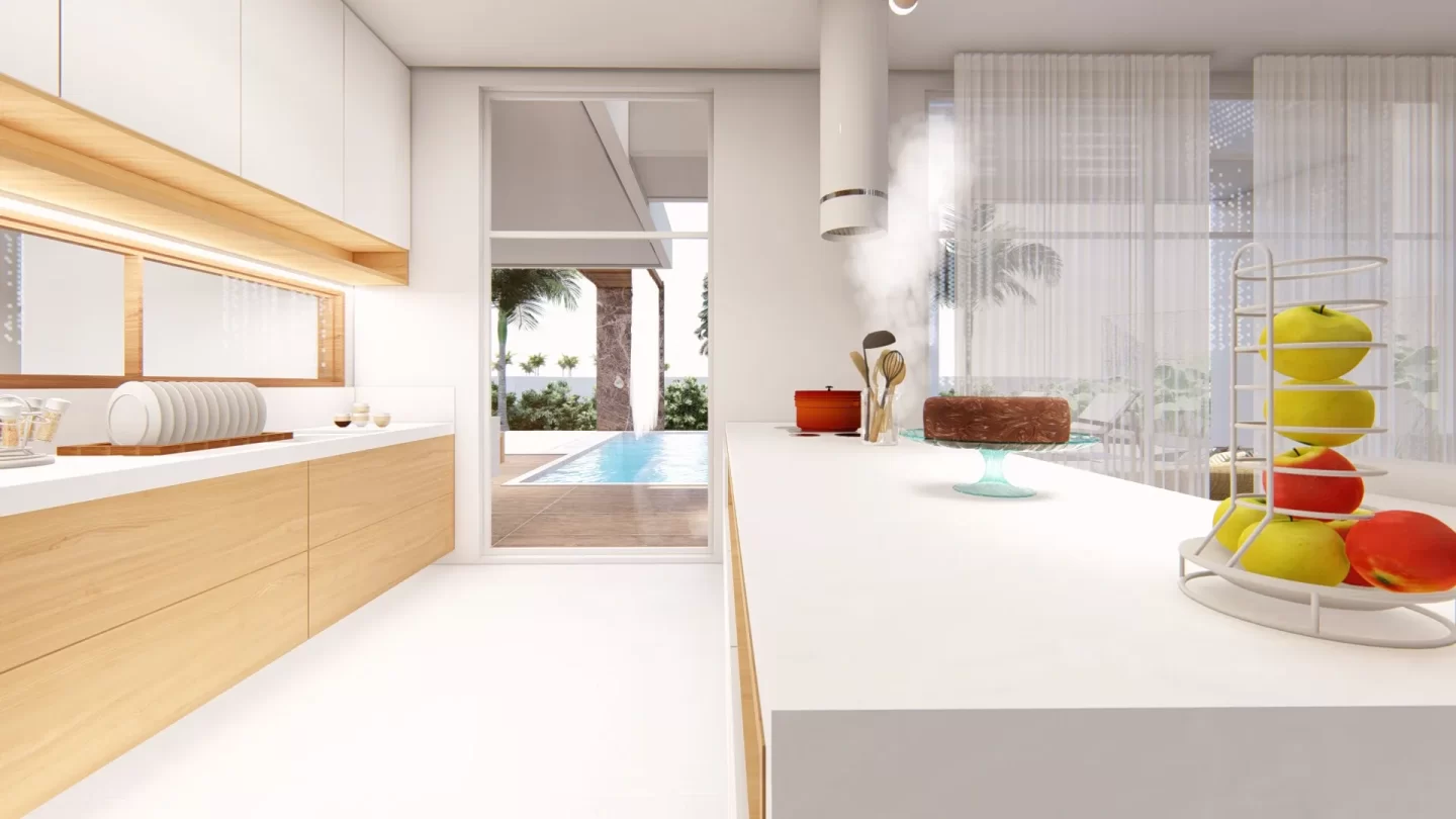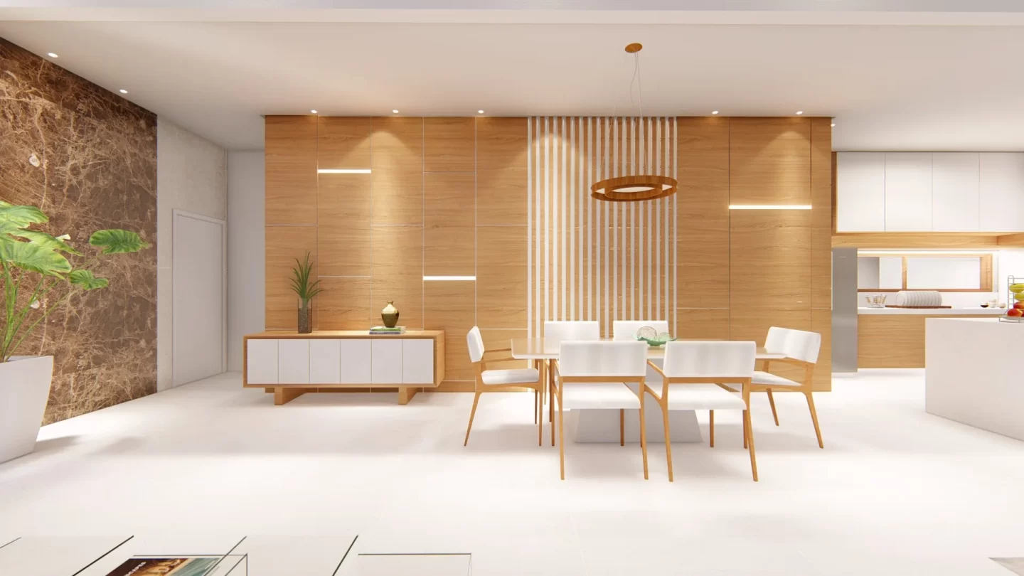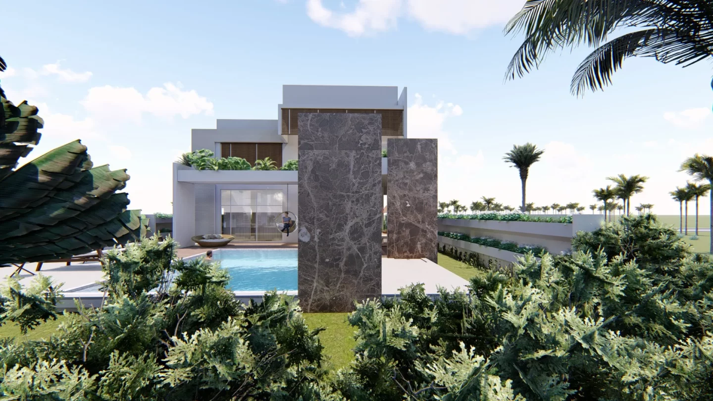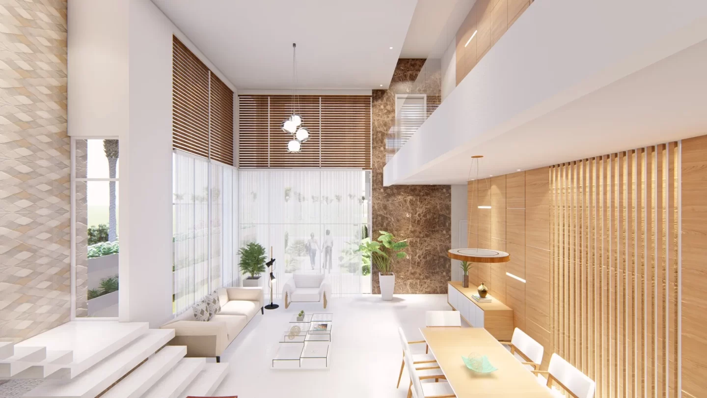 • Distribuição Funcional: Com dois pavimentos, o térreo abriga os setores sociais, de lazer e serviços, incluindo uma área dedicada à piscina e um deck molhado, criando uma integração perfeita entre os espaços internos e externos.